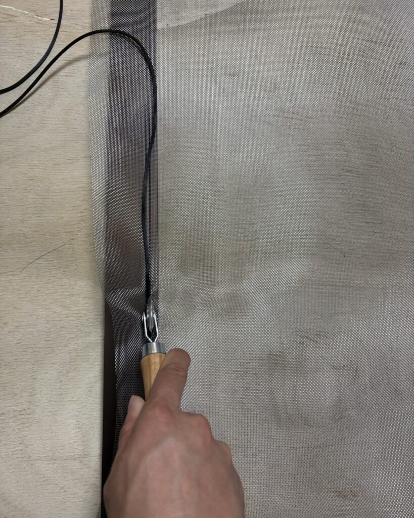 張替えは専用ローラーを使い、ネットのたるみやズレが出ないよう丁寧に施工しています。